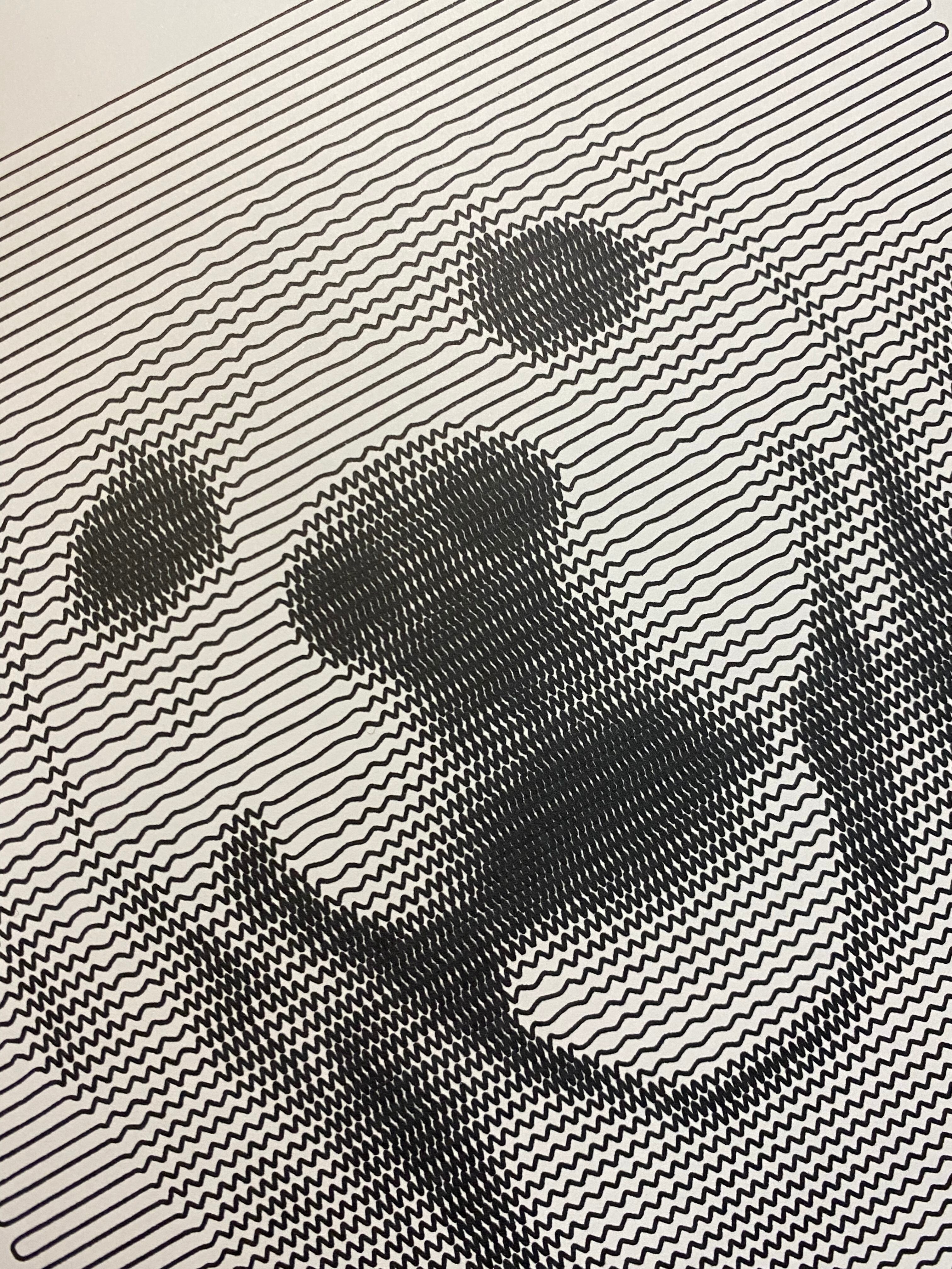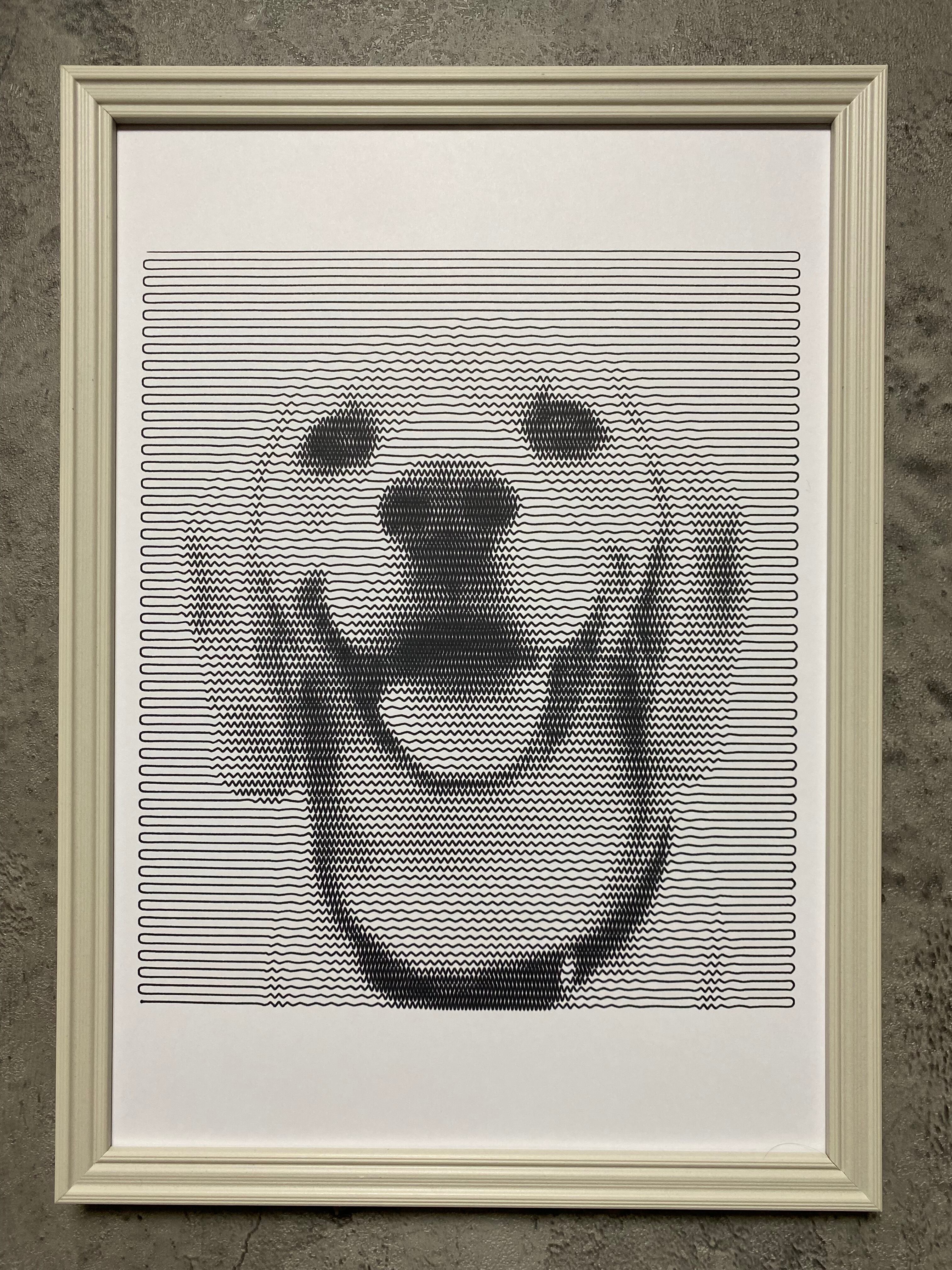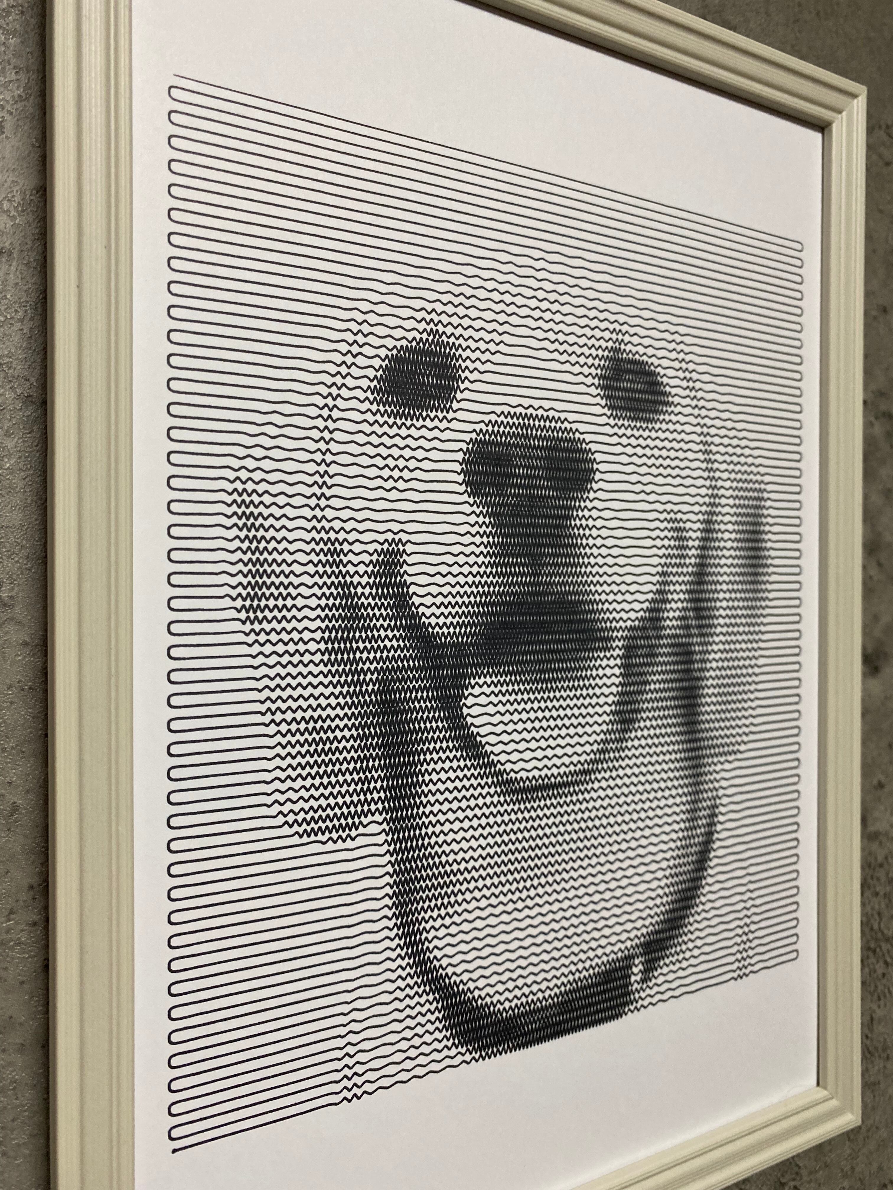 波形の曲線の高さ、密と疎でバランスをとって犬の形や表情を表現しています。